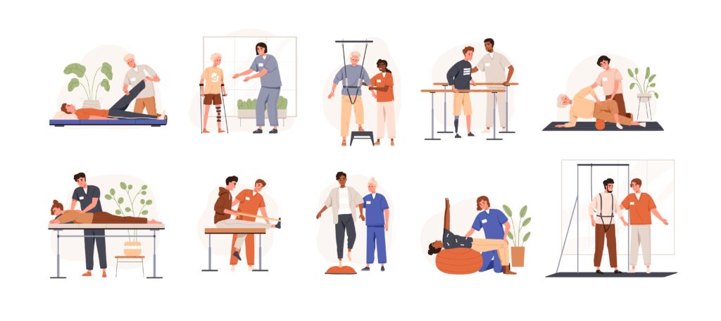 Therapists helping patients during physio therapy and rehabilitation set. Physiotherapy treatment for people with physical disabilities. Flat graphic vector illustration isolated on white background. Physical therapy offers wide-ranging benefits medically, physically and legally. Its primary goals are to restore movement, reduce pain and help individuals return to daily living and work.